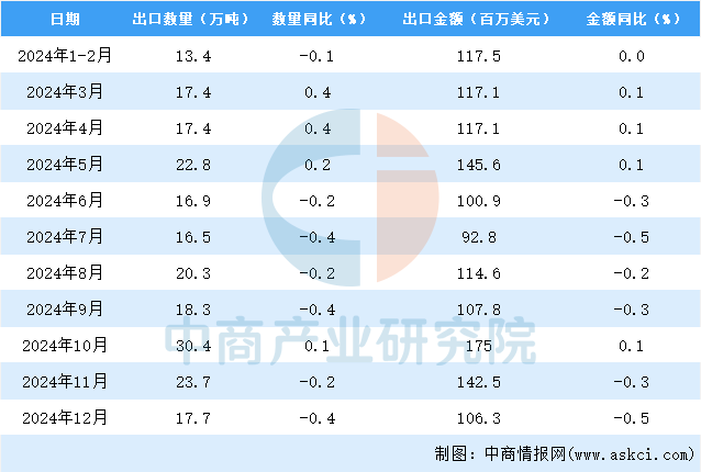 中商谍报网讯:据中商财产研究院数据库显示,2024年12月中国粮食出口量17。7万吨,同比下降0。4%;1-12月我国粮食累计出口量226万吨,同比下降13。7%。2024年12月中国粮食出口金额106。3百万美元,取客岁同比下降0。5%;1-12月我国粮食累计出口金额1430。8百万美元,同比下降18。9%。